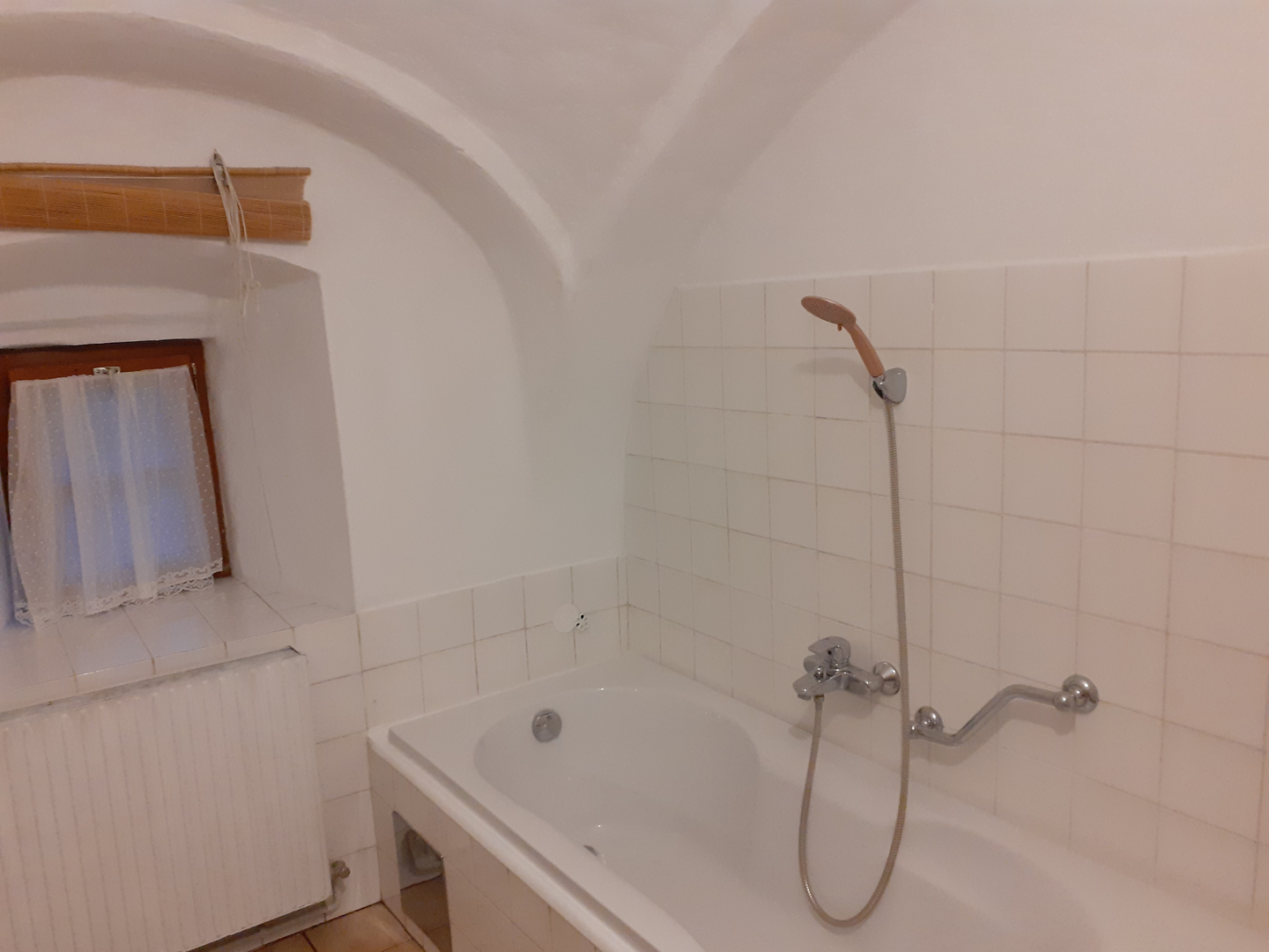 Das Halbstöckl besteht aus einem großen Zimmer mit Kochgelegenheit und einem Badezimmer mit WC. Hier ist die uralte Holzdecke erwähnenswert, die dem Halbstöckl sein ganz besonderes Flair verleiht. Auch die kleinen Fenster, die in den Hof gucken (dadurch ist es hier sehr ruhig), wollten wir nicht durch große ersetzen. Das Halbstöckl hat einen Holzboden.